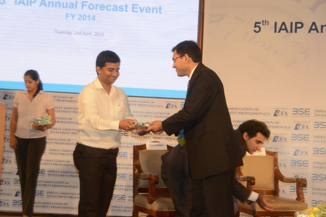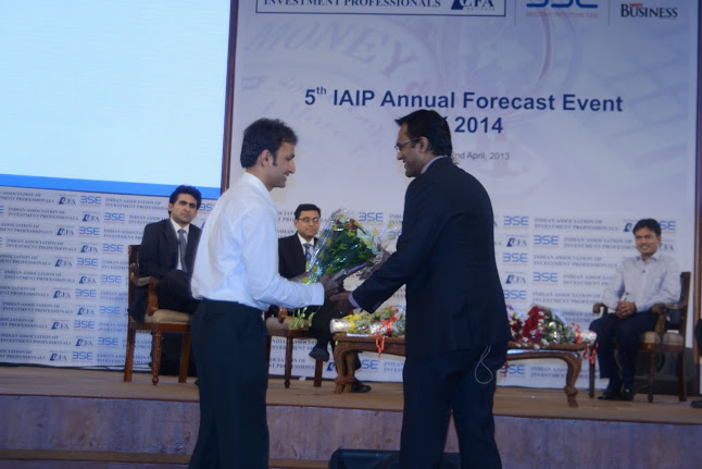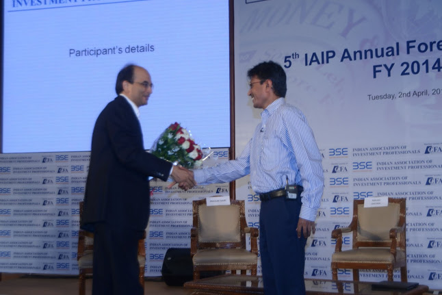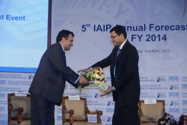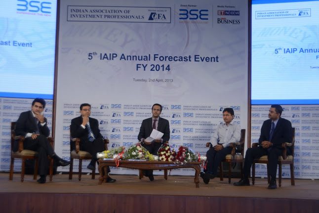 In line with tradition, IAIP organized its Annual Forecast Event for the fifth time in a row at the iconic International Convention Hall at BSE on April 2nd 2013. The event was well attended by both IAIP members and non-members. The proceedings started off with a welcome speech by Sunil Singhania CFA, President IAIP and followed by an address from V Balasubramaniam, Chief Business Officer BSE. Balasubramaniam gave a brief on the transformational changes that BSE has done over the past few months. BSE has tied up the S&P for up gradation of the value delivered to the investors and other market participants. With technology leapfrogging, BSE has installed user-friendly systems and now is witnessing increasing derivative volumes. Anil Ghelani CFA, Chair Programming, CE and Networking, IAIP, then introduced each of the panelists and invited them to take their seats on the podium. This included Neelkanth Mishra, Nilesh Shah, Prasun Gajri, and Sajjid Chinoy. Just before the panel discussion, Jayesh Gandhi, CFA, Director, IAIP ran through the findings of the recently concluded Annual Forecast Survey for FY14. Anil then announced the names of the winners who correctly predicted the levels of Sensex, 10 year G-Sec yield, Gold, Brent, & Rupee/USD as on the close of FY13 a year back. A token of appreciation was presented to these winners by the panelists. This was followed by panel discussion moderated by Nikunj Dalmia, Stock Editor, ET Now, one of the leading business news channels in the country. Covering a range of topics from government policies to foreign institutional investors fund flows to attractiveness of asset classes, sectors within equities to invest in; he engaged the audience and kept the discussion peppy and lively. The event closed with the vote of thanks by Amit Khurana CFA, Director IAIP.