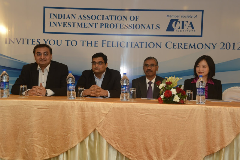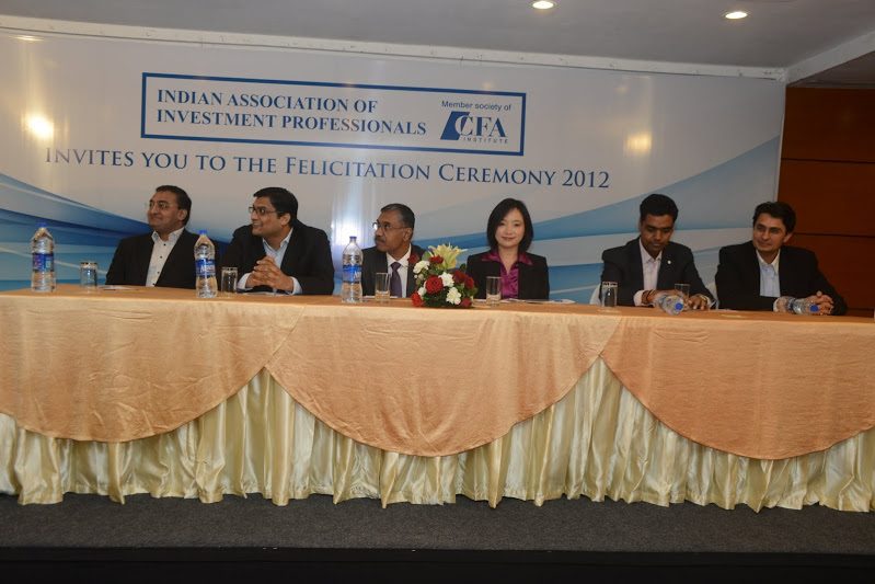 IAIP organized Felicitation Ceremony for the new CFA Charter holders and level 3 pass-outs in Mumbai on December 13th 2012. The event was presided by chief guest Annie Lo, Director, GIPS, CFA Institute along with Navneet Munot, CFA, Jayesh Gandhi, CFA, Vidhu Shekhar, CFA, Anil Ghelani, CFA, Biharilal Deora, CFA all directors of IAIP. Annie explained about how CFA institute functions and how axis has shifted to Asia in terms of number of candidates and CFA charter holders. India and China lead the CFA applicants table and are also witnessing higher number of charter holders. Biharilal Deora, CFA explained the functioning of IAIP and the importance of volunteerism for the society. He also mentioned the advantages of being a member which gives a candidate access to job portal as well as numerous networking opportunities with respected people in the investment industry. Navneet gave insight on the current economic situation and how he expects the near future to pan out while Vidhu explained the importance of the CFA charter in times of reducing level of corporate governance and lower ethical conduct in the financial industry.