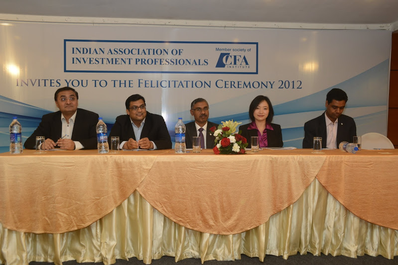 IAIP organized Felicitation Ceremony for the new CFA Charter holders and level 3 pass-outs in Mumbai on December 13th 2012. The event was presided by chief guest Annie Lo, Director, GIPS, CFA Institute along with Navneet Munot, CFA, Jayesh Gandhi, CFA, Vidhu Shekhar, CFA, Anil Ghelani, CFA, Biharilal Deora, CFA all directors of IAIP. Annie explained about how CFA institute functions and how axis has shifted to Asia in terms of number of candidates and CFA charter holders. India and China lead the CFA applicants table and are also witnessing higher number of charter holders. Biharilal Deora, CFA explained the functioning of IAIP and the importance of volunteerism for the society. He also mentioned the advantages of being a member which gives a candidate access to job portal as well as numerous networking opportunities with respected people in the investment industry. Navneet gave insight on the current economic situation and how he expects the near future to pan out while Vidhu explained the importance of the CFA charter in times of reducing level of corporate governance and lower ethical conduct in the financial industry.